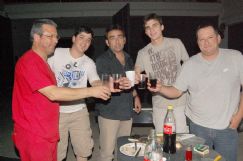 Cinco servidores bomberiles sentados en una mesa en el patio del cuartel han terminado un sabroso costillar de cerdo. Palillo entre dientes, descorchan la única botella de champán, un vasito para cada uno, dicen, Dani, Chicho, Checho, Fefé y Bombi. Hasta ese momento ningún llamado. Suponían que después de las 2 algún accidente o quemadura se le harán presente. El deseo es que mejor no.
