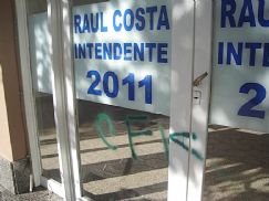 Desde el local que ocupa el candidato a intendente Raúl Costa, denunciaron que autores ignorados realizaron pintadas en el acceso al inmueble, similares a las perpetradas días atrás, en la fachada del edificio donde funciona la sede del Frente Cívico y Social.