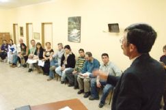 | Parte de la treintena de vecinos que se reunieron en el Centro de Periodistas “Lucio Capdevila”. A la derecha, en el uso de la palabra, el sacerdote evangélico Ricardo Rivarola |