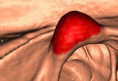 | En la primera foto, una colonoscopía virtual. En la siguiente, una imagen de pólipo colónico |