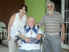 | Granado, con la camiseta de Gimnasia de La Plata, flanqueado por Norma Poncio y Daniel Baysre, villamarienses que lo visitaron en diciembre |