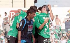 | Punteros. Los jugadores de Sportivo Belgrano celebran mientras lo sufre Dopazo (foto www.diariosports.com.ar) |