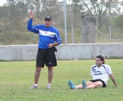 | Riggio. El “Tano” dialoga con el “Tanito”, quien elonga desde el piso. El entrenador espera una buena campaña en la Fase Reválida |