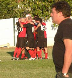 | Mientras los jugadores de Colón festejan la victoria, se nota en un primer plano el sufrimiento del técnico de Rivadavia, José Luis Danna - Hubo esfuerzo e intenciones, pero no fue un gran clásico el jugado ayer en Cabral |