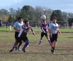1) Un instante del cotejo en el cual Aguila Seguridad, que concluyó en el primer puesto de la Zona 2, derrotó por 3-1 a Transporte Alvear.