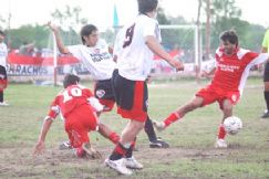| Pierna fuerte. Danilo Peretti le va con todo a Diego Acosta, mientras Delfino mira desde el suelo. Alem, luego, desarrolló un gran partido y goleó al local |