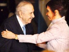 | Raúl Alfonsín, el radical que encabezó la recuperación de las instituciones, recibiendo el reconocimiento de la actual presidenta justicialista Cristina Fernández |
