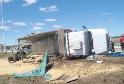 Los bruscos movimientos del camión, sumados al peso de la carga, hicieron que el acoplado se desprendiera del chasis y perdiera las ruedas delanteras. La cabina, quedó mirando exactamente en el sentido contrario al que circulaba. Pero antes de volcar, el rodado de gran porte tumbó un poste del alumbrado público y siete tramos del guard-rail.