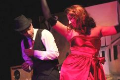 El Elenco Municipal de Teatro, dirigido por Walter Staüble, se puso al hombro esta ambiciosa puesta en la cual no sólo debe respaldar el imaginario de dos superestrellas sino que además debe emplear -por primera vez en la historia del grupo- coreografías tangueras a modo de lazos narrativos. Para ello sumó al bailarín Julián Fernández quien dibuja ochos y firuletes junto a Carolina Ungini (la Muerte) y la sensual Marina Monti (la Rita joven), coordinados por los profesores Mariana Britos y Germán Macía (como asesor externo). Britos es, a su vez, la Rita decadente quien hace migas -de buena simbiosis en escena- con Leonardo Negro, el Carlos anciano.