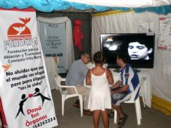| Un stand de información de la fundación. En la pantalla un vídeo con el mensaje de Gastón |