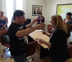 | Un vecino recibe el certificado de manos de una funcionaria |