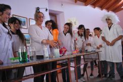 Los alumnos de 6to., desde Ciencias Naturales y con la docente Yanet Beletti, se encargaron de mostrar a su manera experimentos con química. Es que en esta oportunidad, para mostrar el estado de la materia, la flotación de un huevo en salmuera, demostrar cómo el aire ocupa lugar o inflar un globo sin soplar, los pibes eligieron disfrazarse de "científicos locos" y divertir al público, compuesto por alumnos de la escuela primaria Joaquín V. González, de la localidad, padres, alumnos y los demás docentes.