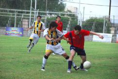 | Mientras hubo acción en Plaza Ocampo, Ulises Bonaveri, en la imagen presionando a Vos, aportó su habilidad y provocó el penal que le da el 1-0 transitorio a favor de Unión Central - El árbitro Aldecoa no pudo seguir ante una lesión |