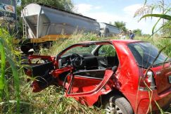 En ese punto de la zona colisionaron el Fiat Palio, dominio KCU 058, que conducía Emanuel Urbani (28), quien fue trasladado por los Bomberos al Hospital Regional Pasteur donde se diagnosticó que resultó con heridas leves, y el convoy con 70 vagones guiado por Miguel Alberto Ferreyra (50), a quien acompañaba el jefe de conductores, Enzo Sires (27), ambos domiciliados en Villa María.