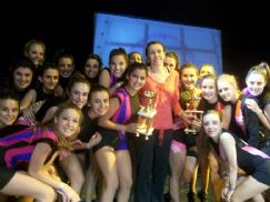 | Las chicas de Rosarinas junto a su entrenadora Claudia Rizzi y sus copas |