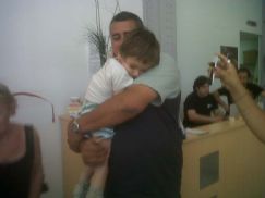 | Joaquín en brazos de su papá Marcelo Chanquía, cuando el viernes se retiraban de la Medioteca, tras la conferencia de prensa en que anunciaron la colecta de esa misma noche |