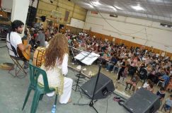| El club se mostró totalmente colmado. Los asistentes apreciaron la música desde sus lugares. F2: Los papás Marcelo y Marisa, con Joaquín en brazos, junto a Héctor Cavagliato sobre el escenario del Ameghino |