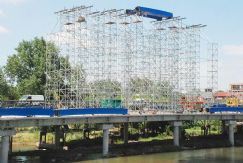 El ensamble se realiza en el mismo lugar y posteriormente se dará lugar al montaje final, permitiendo (tras el retiro de los pilotes), que el puente quede colgante.