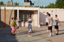 | Algunos integrantes del Lechuzas Villa María juegan al vóley con chicos del barrio Roque Sáenz Peña |