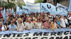 | Juan Monserrat, secretario adjunto de la UEPC, encabezando la marcha en la capital provincial (foto gentileza El Diario de Carlos Paz) |