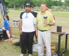 El juez de la muestra, el criador José María Argüello, forma parte de la tercera generación de criadores y es número uno de Córdoba, pidió a futuro los servicios de "Rocco" para mejorar el estandar de los ejemplares que los soliciten. En la imagen, Amelio Acosta, el orgulloso abuelo del joven Agustín, presidente de la "Agrupación Villa María de Ovejeros Alemanes", al momento de recibir el correspondiente trofeo.