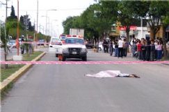 | El cuerpo del infortunado joven en el medio de la calle. Atrás de los móviles policiales se observa al camión |