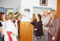| El ex alumno Rogelio Cativelli, rodeado por la actual directora, la inspectora y ex docentes, descubre la placa recordatoria |