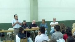 | Autoridades municipales, policiales y Gustavo Ballas frente a los asistentes a la charla |