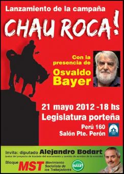 Hoy a las 18 en la Legislatura de la ciudad de Buenos Aires, el historiador Osvaldo Bayer y el diputado Alejandro Bodart lanzarán la campaña "¡Chau Roca!", que procura eliminar los homenajes que se le propician al militar y político argentino, por su responsabilidad en el genocidio de los pueblos originarios.