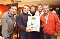 | Mariano Werner, con la caricatura que le obsequió un grupo de amigos, el domingo por la noche en esta ciudad |