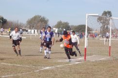 | El arquero de La Casa del Electricista se apresta a agarrar la pelota dentro de su área |