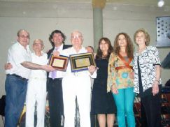 | Francisco Bonaveri y Roberto Domenino, junto a sus familiares y dirigentes, durante la premiación |