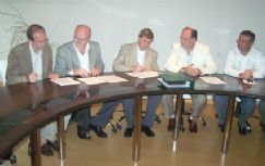 El presidente del Instituto Municipal de Inversiones, José Carignano, y los apoderados de la UTE riocuartense Marinelli - Hinsa firmaron ayer el contrato (foto) para poner en marcha la ampliación de la cloaca máxima y la planta depuradora de líquidos cloacales.