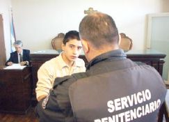 | Lucas Díaz es esposado por un efectivo del Servicio Penitenciario. Está acusado, junto a su amigo M. T., de haber asaltado a cuatro adolescentes. Detrás, el secretario Roberto Jue |