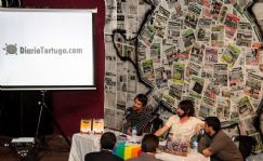 | Maxi Goldschmidt y Pablo Bruetman de Cítrica, junto al anfitrión Sebastián Gualda de Papel Tortuga, dialogan con el público |
