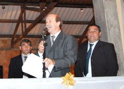 Discurso (foto 1). Galfione habla flanqueado por Pérez y Noriega. Las autoridades de AVAF agradecieron la presencia en la fiesta