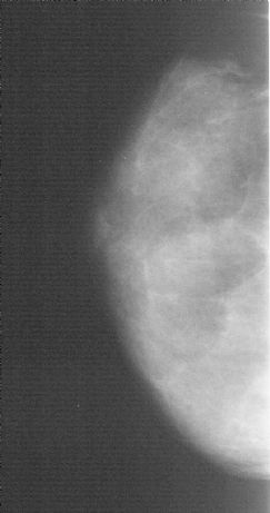 Mostramos una foto de una mamografía común de una mujer de 35 años donde el tejido es muy denso y nuestro diagnóstico se ve extremadamente limitado, debiendo recurrir a ecografía y a otros medios para poder llegar a un diagnóstico aproximado.
