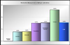 El resultado del rubro carnes se debió principalmente a los incrementos registrados en costilla (18,79%), carne picada (9,72%), vacío (8,39%), pollo (4,60%), merluza (3,95%) y costeletas (2,74%). Estos se vieron atenuados por descensos en bife de hígado (1,59%) y bola de lomo (0,86%).
