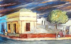 El artista plástico Raúl Olcelli, socio de la Cooperativa Comunicar, dejó retratada en un acrílico la histórica esquina de Tucumán y Mariano Moreno donde supuestamente funcionó la posta antes de que Villa María fuera una población organizada.