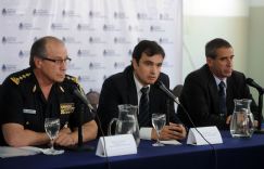 1) El subsecretario de Seguridad, Darío Ruiz, flanqueado por el juez Manuel de Campos y el jefe de la Policía Federal, Román Di Santo, durante la conferencia de prensa brindada ayer