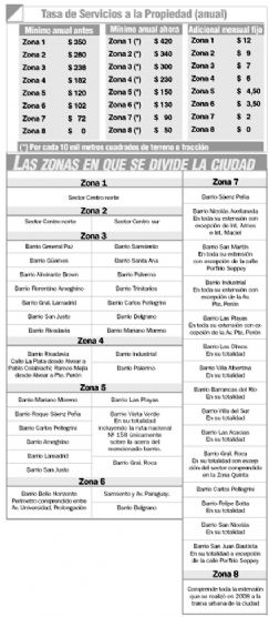 En 2005, por ejemplo, el valor de la Tasa anual para la Zona 1 era de 250 pesos, tiempo más tarde se modificó y pasó a 350 pesos, para finalmente quedar en 2009 en 420 pesos por cada 10 mil metros cuadrados de terreno o fracción (ver cuadro Tasa).