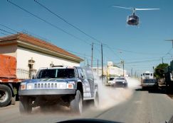 | En este montaje fotográfico nos imaginamos el paso de los autos del rally y los helicópteros por la ruta pesada, con el fondo del Hospital Pasteur como testigo |