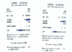 | Los dos tickets que evidencian la carga realizada. La señora mostró los mensajes de texto del día siguiente en los que se le informa de una acreditación que no es la prometida |