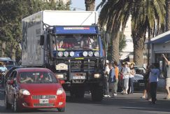 | Un enorme camión del Dakar pasea su imponente figura por las calles de Villa María, el sábado a la mañana. Miles de personas vieron pasar a los pilotos, en una jornada inolvidable |