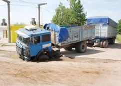 En la citada intersección, donde el municipio prepara la calzada para la inminente pavimentación, el camión de Priano quedó varado.