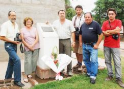 | Los reporteros locales junto a Ana María Cruz, propietaria de la vivienda en cuya vereda está emplazado el monolito que recuerda a José Luis Cabezas |
