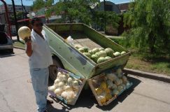Parado en la esquina de la escuela Nicolás Avellaneda, el hombre ofrece diariamente su mercadería. Sandías y melones “de los mejores”.