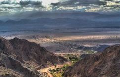 Por ahora, el hombre no piensa en recorridas, si no en el regalo que le da la vida. Las termas son un complejo pequeño y sencillo, de piletones escalonados que suben en calor, lo cual se aprecia con el frío. Heladas las noches otoñales. Las de invierno, gélidas. Pero adentro del agua, el mundo es una maravilla. Las termas están ubicadas a unos 20 kilómetros de la médula urbana, y para llegar a ellas hay que seguir un camino asfaltado que trepa de a poco y va contando todo lo lindo de la zona. Horizontes que delinean cúspides, cadenas de belleza, y en la previa, territorio de aridez y desierto. Unas dunas de arena gigantes sirven de postal y de circunstancia para que, muy de vez en cuando, algunos locos las trepen a zapatilla limpia, en carreras hechas para maquinas, la calavera de una vaca como público.