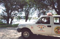 | Una camioneta de los Bomberos llega al lugar donde ocurrió la tragedia. En este lugar se arrojaron los chicos para cumplir con el reto que se habían propuesto, cruzar el Balneario Mulinetti |