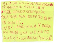 La nota adherida a una de las tantas mochilas, junto a otros muchos elementos donados para los hermanos de Tartagal afectados por el alud del 9 de febrero, nubló la vista a más de uno de los voluntarios que ayer realizaban la clasificación, en el armado del nuevo cargamento humanitario que partirá mañana por la madrugada